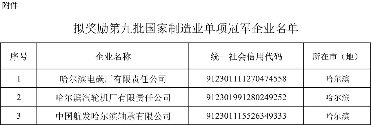 關(guān)于國家制造業(yè)單項冠軍擬獎勵企業(yè)名單的公示發(fā)表時間:2025-12-23 15:42 按照《黑龍江省人民政府辦公廳關(guān)于印發(fā)黑龍江省推動工業(yè)振興若干政策措施的通知》(黑政辦規(guī)〔2022〕8號)、《黑龍江省工業(yè)和信息化廳黑龍江省財政廳關(guān)于印發(fā)黑龍江省支持企業(yè)技術(shù)改造等13個政策實施細(xì)則的通知》(黑工信規(guī)劃聯(lián)規(guī)〔2022〕10號)等文件要求,省工信廳擬對我省第九批國家制造業(yè)單項冠軍企業(yè)兌現(xiàn)獎勵政策,對國家制造業(yè)單項冠軍給予一次性獎勵200萬元。同時獲得專精特新“小巨人”和國家制造業(yè)單項冠軍的企業(yè),只享受最高標(biāo)準(zhǔn)獎勵。為保證公平、公正、公開,現(xiàn)將擬獎勵企業(yè)名單予以公示,接受社會各界監(jiān)督。公示期為2025年12月23日—12月29日(5個工作日)。如有異議,請在公示期內(nèi)向省工信廳反映。 聯(lián)系電話:0451-82621109。 黑龍江省工業(yè)和信息化廳 2025年12月22日