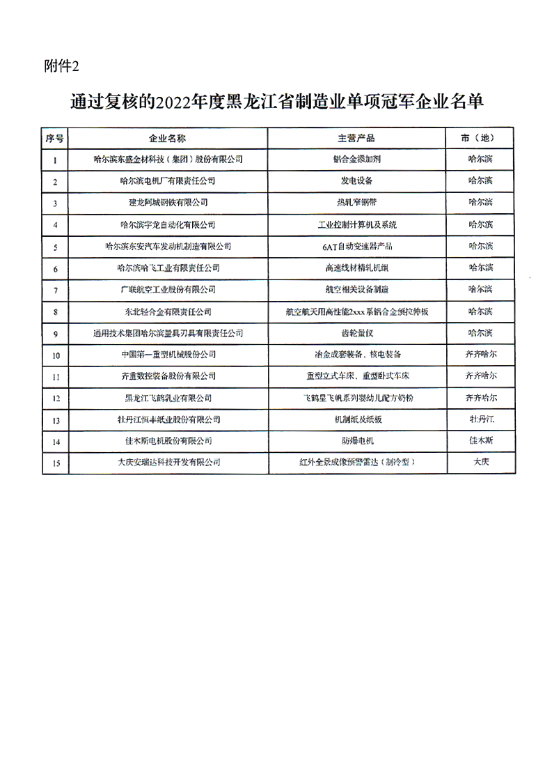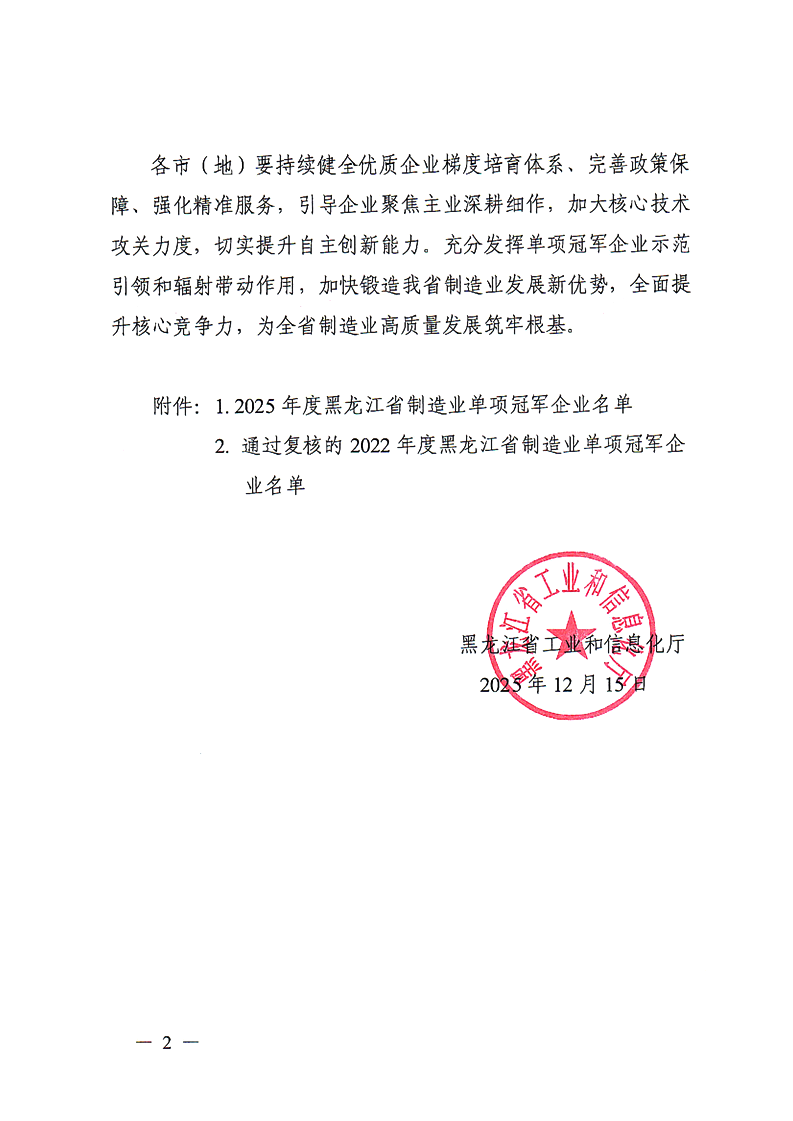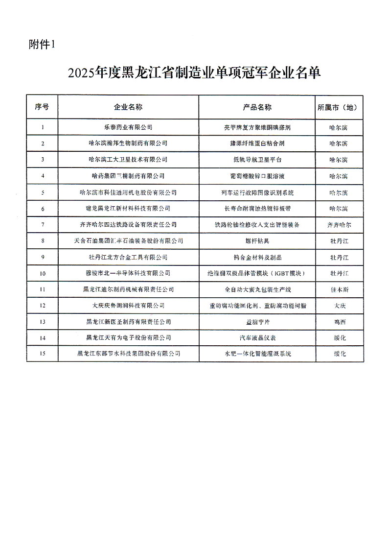 關于印發2025年度黑龍江省制造業單項冠軍企業及通過復核的2022年度制造業單項冠軍企業名單的通知