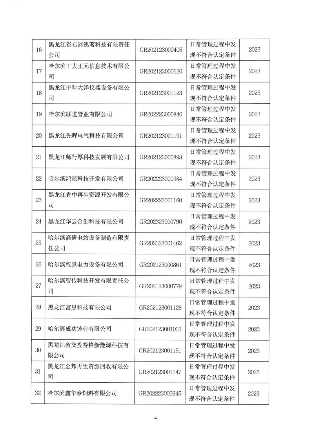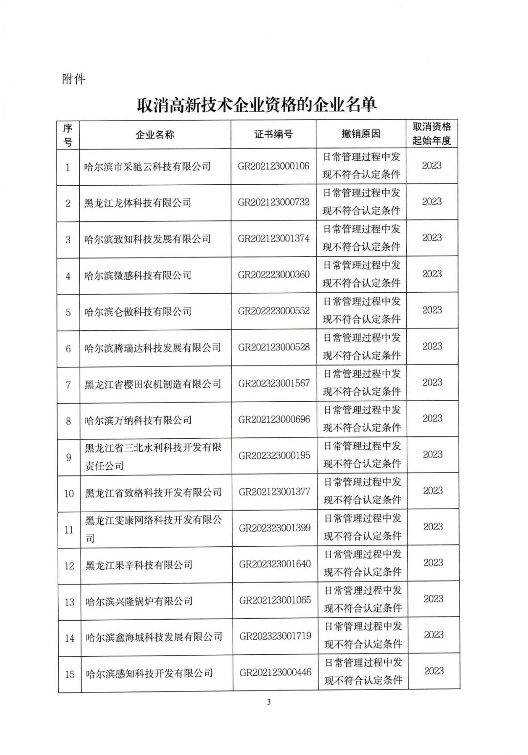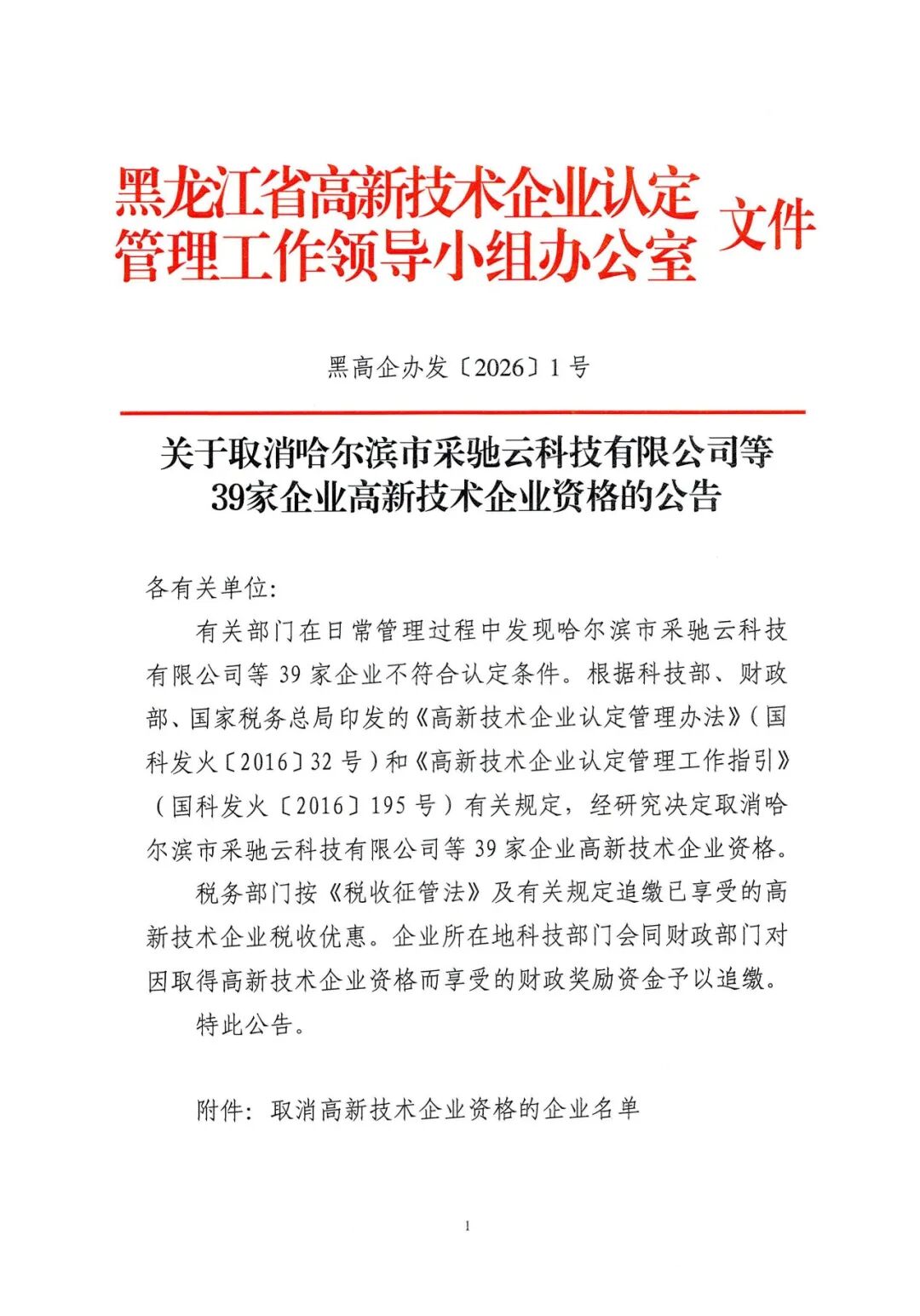 黑龍江省認定機構:關于取消哈爾濱市采馳云科技有限公司等39家企業高新技術企業資格的公告
